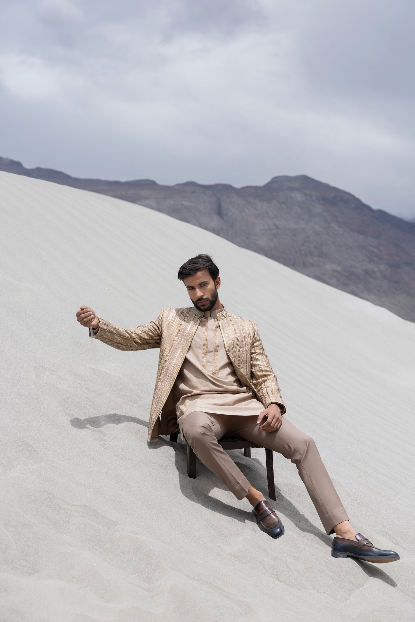 Beige front open silk jaquard indowestern jacket with monotone hand-embroidery paired with an embroidered kurta and pants.