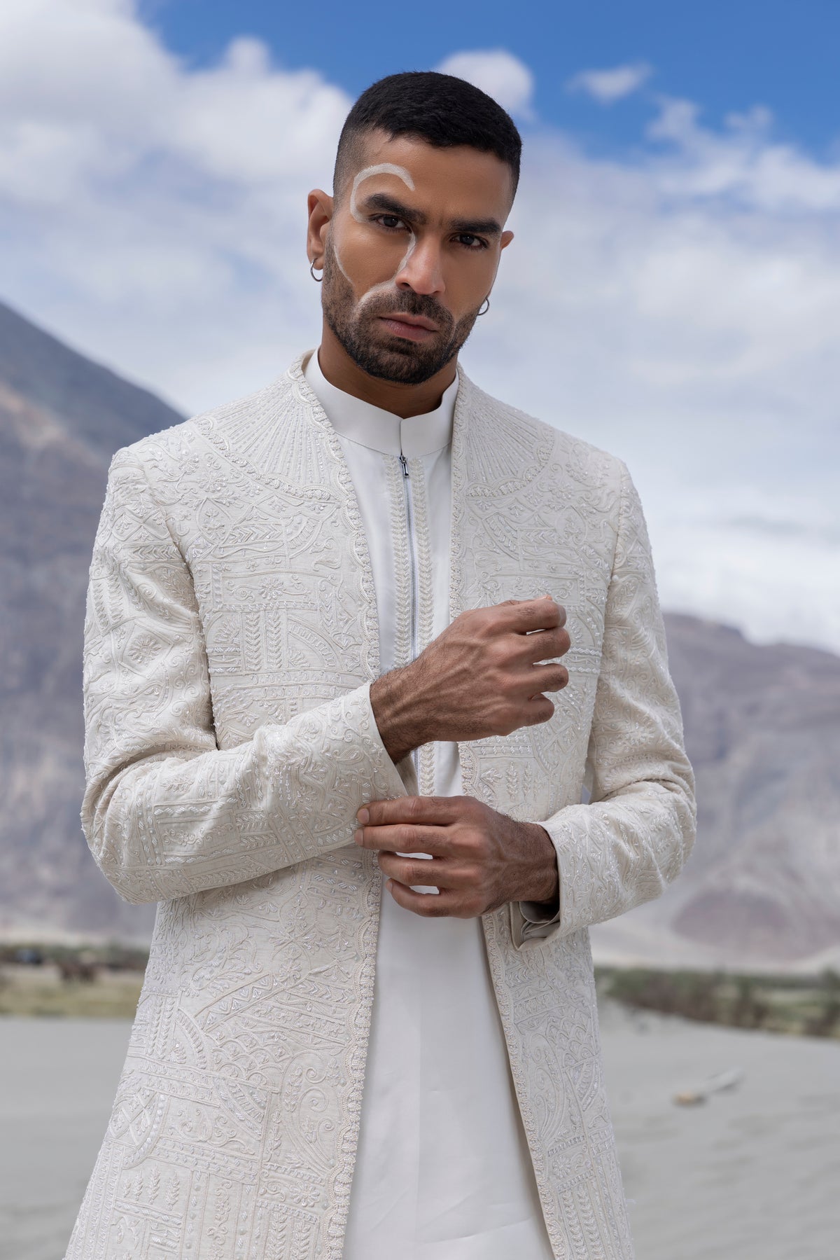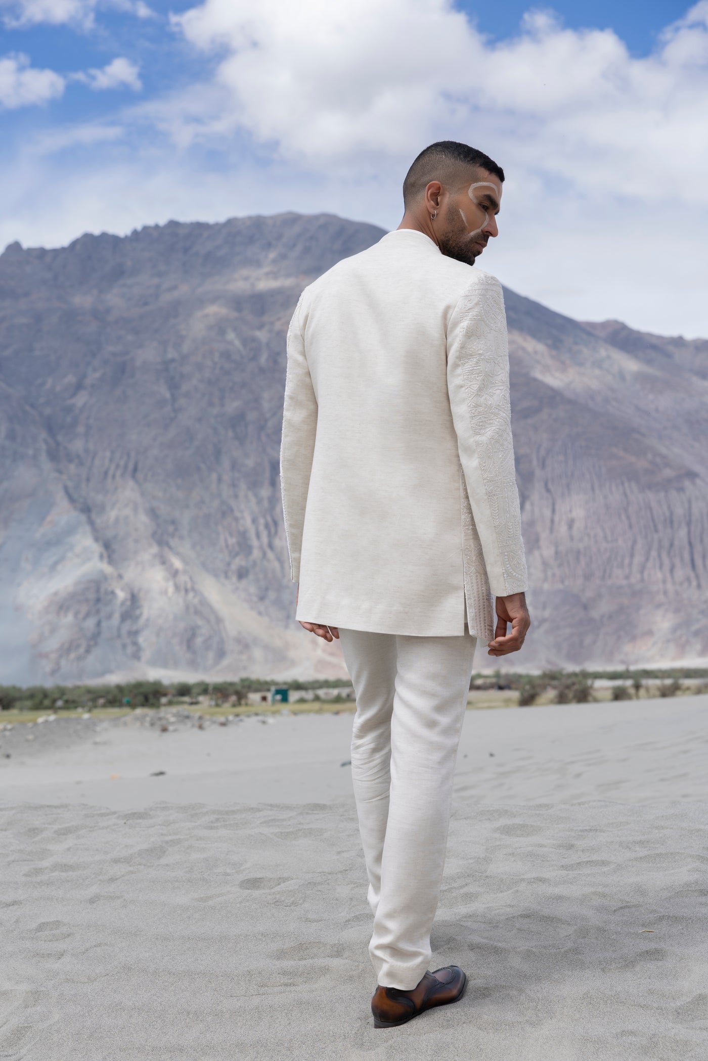 Beige poly linen, front open short indowestern jacket with monotone hand-embroidery paired with an embroidered kurta and a poly linen pant.