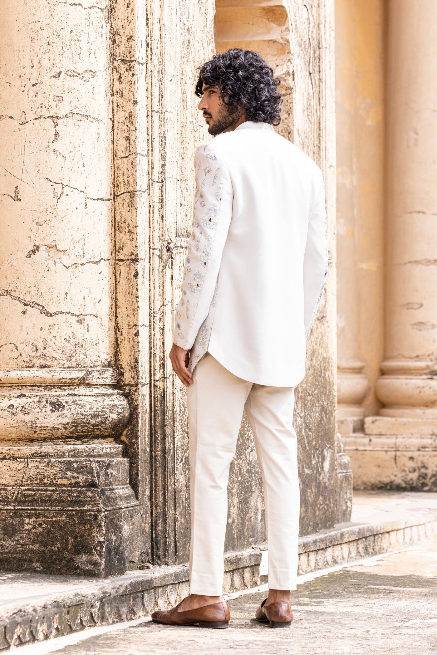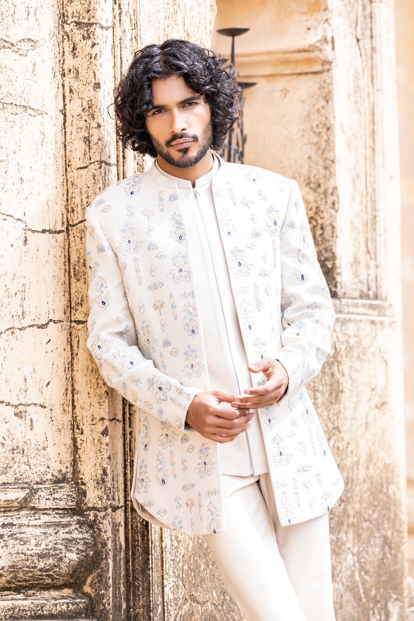 Cream front-open indowestern jacket embellished with hand embroidered pastel motifs paired with a zipper waistcoat and pants.