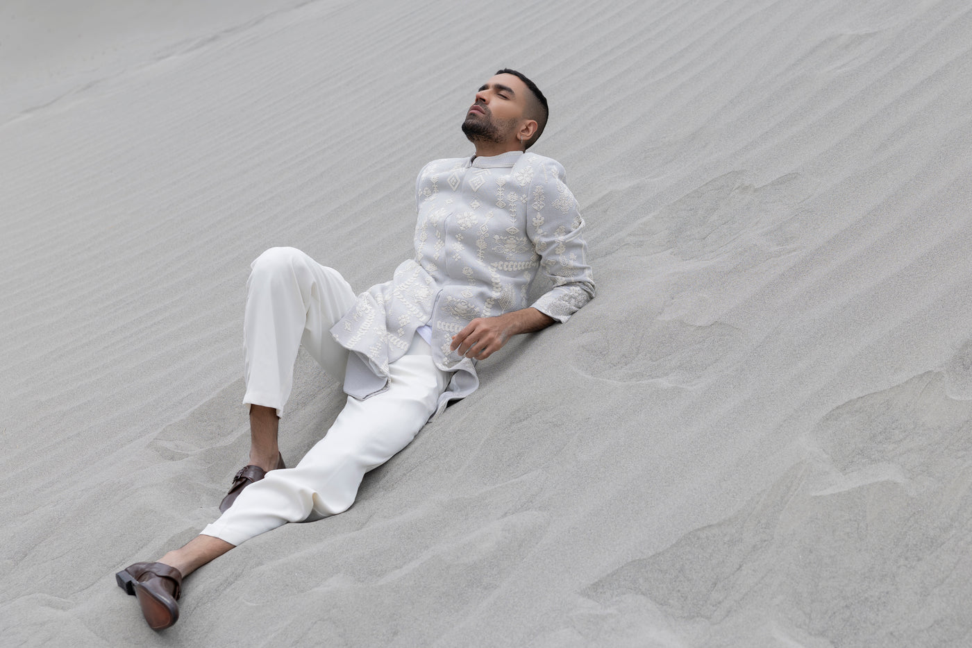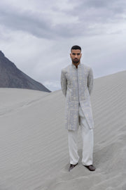 Grey long indowestern jacket with ivory hand-embroidered motifs paired with an ivory pant.