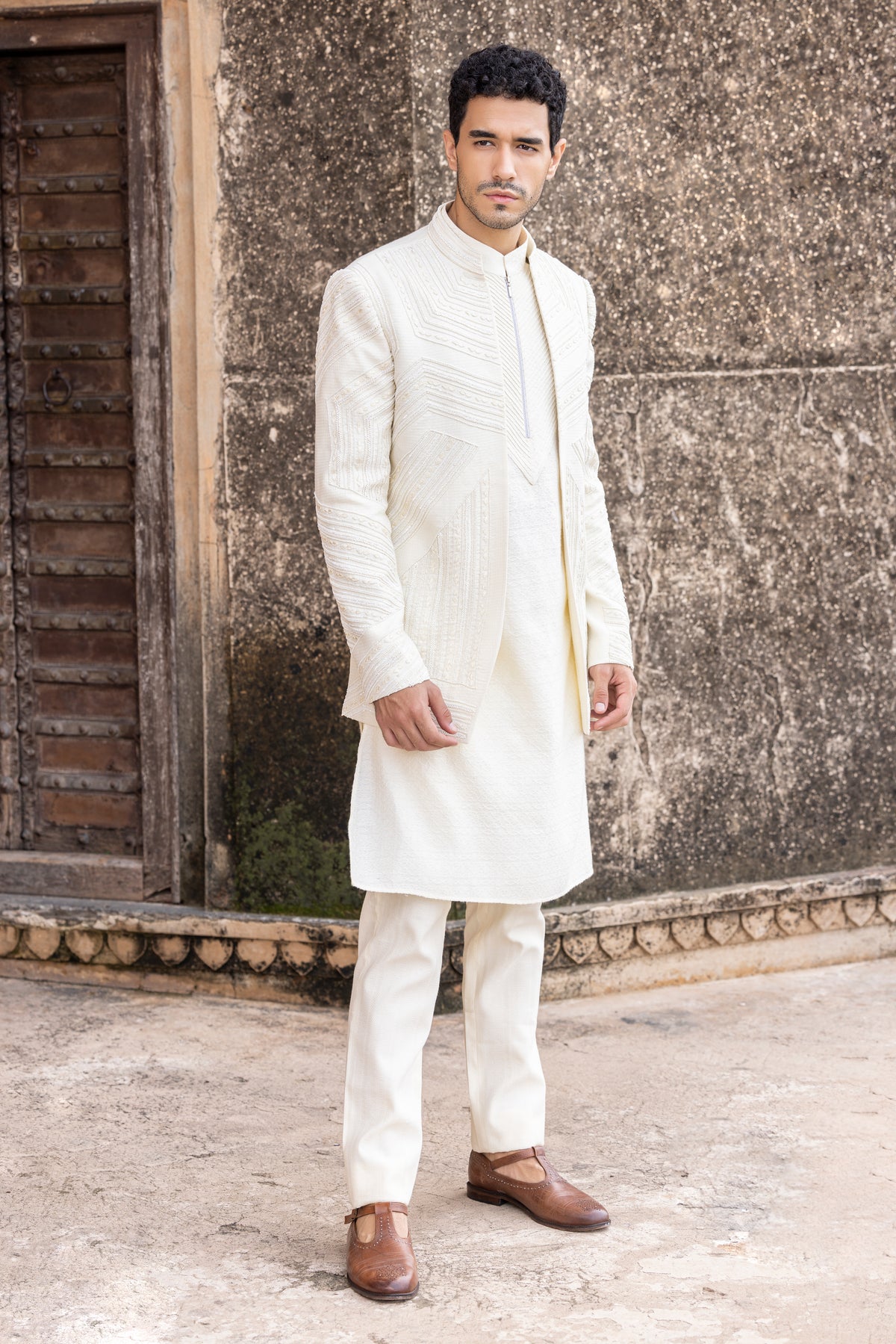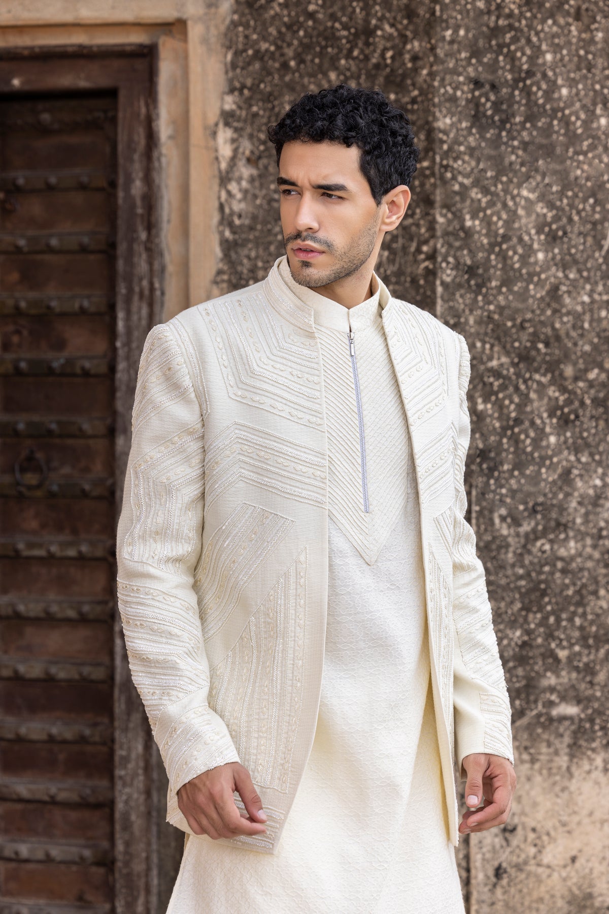 Ivory front-open indowestern jacket highlighted with intricate hand embroidery in geometrical patterns, paired with kurta and pants.