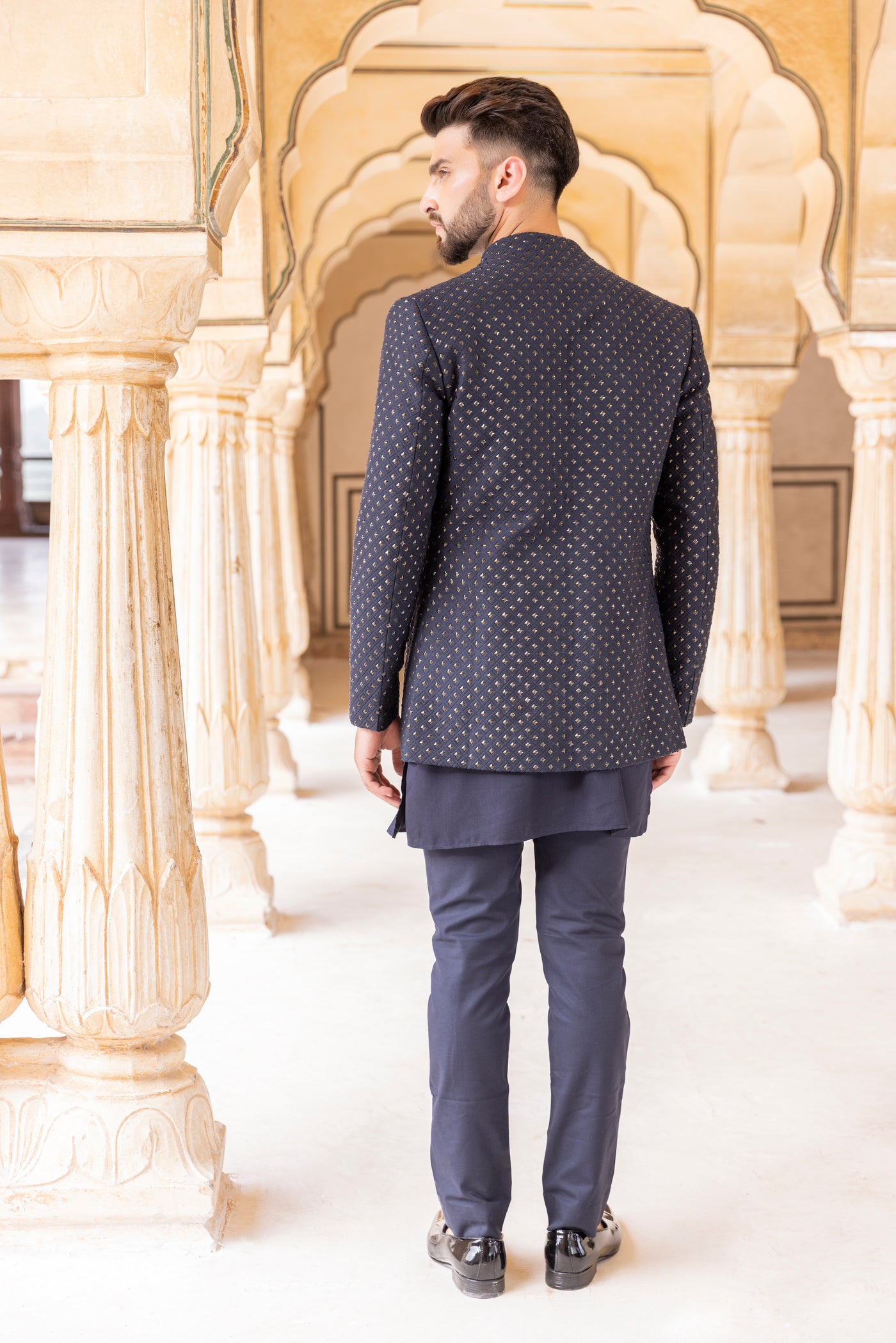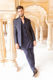Navy Blue front open indowestern jacket embellished with metal work paired with a kurta and pants.