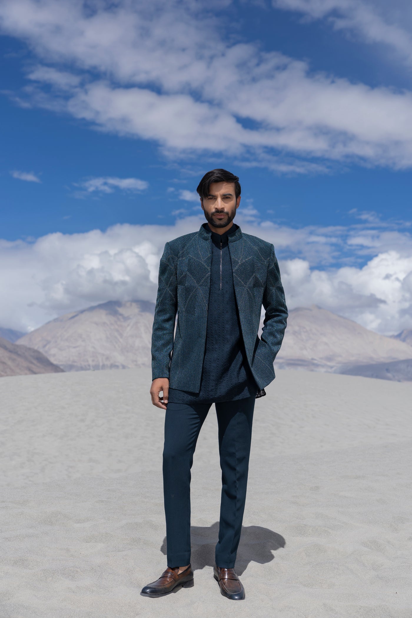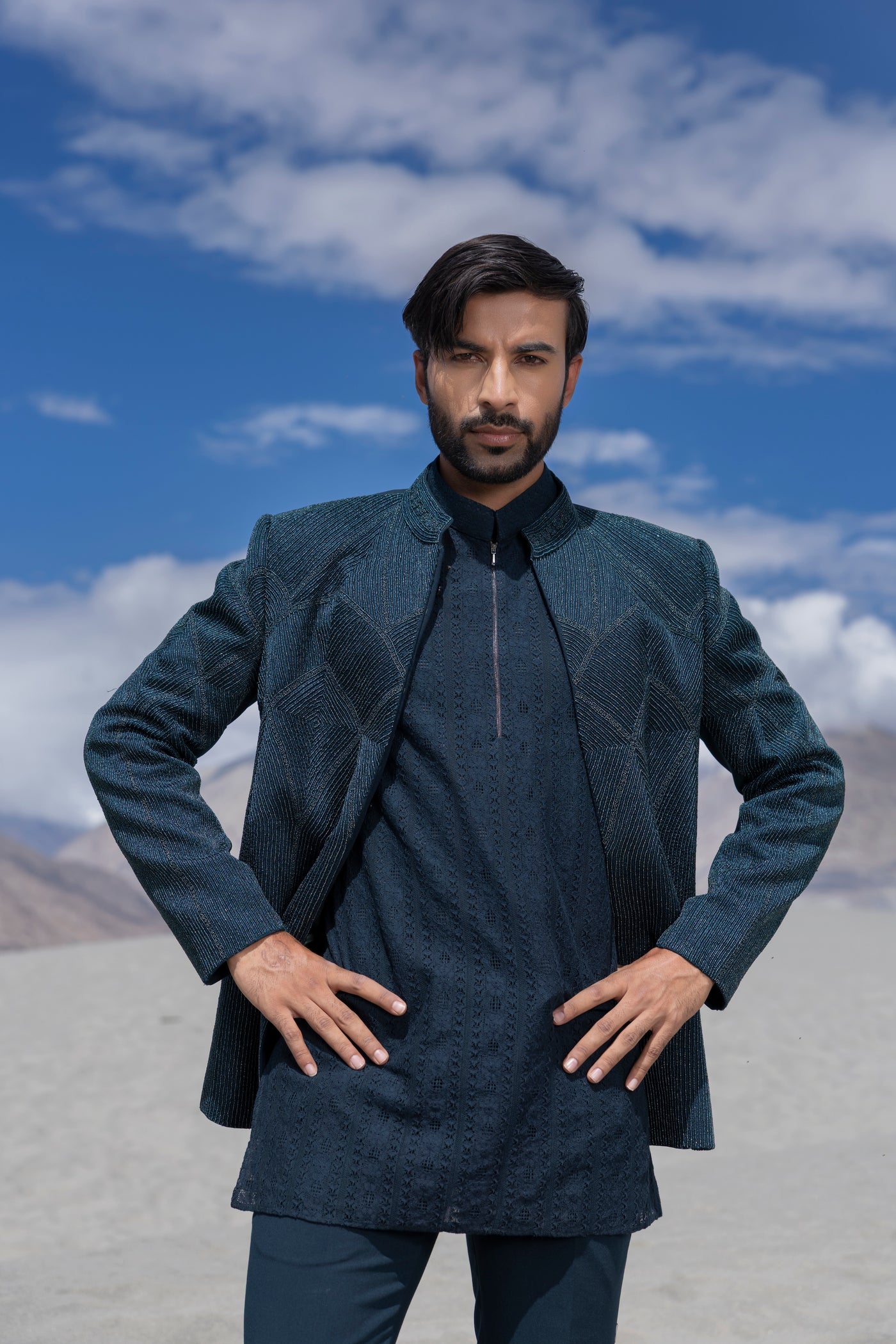 Turquoise front open indowestern jacket with monotone hand-embroidery paired with a crochet kurta with zipper detailing and a pant.