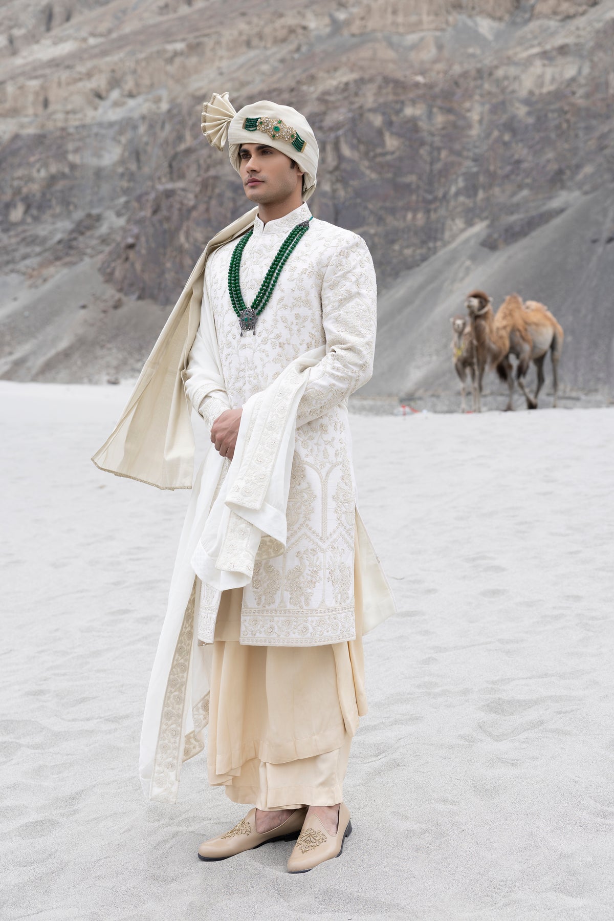 Cream raw silk sherwani with intricate hand-embroidery paired with a contrast coloured modal kurta pyjama & an organza stole.