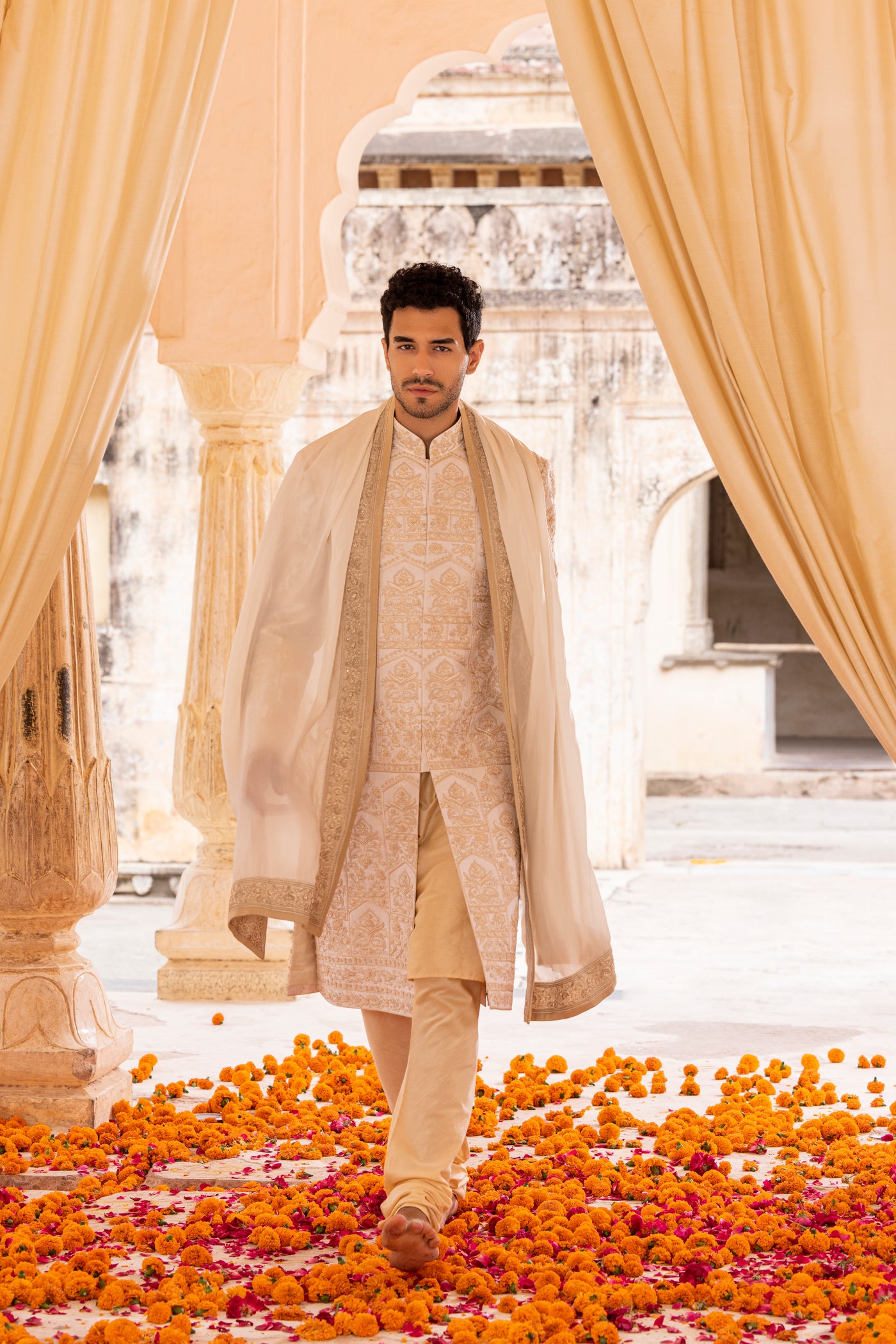 Hand embroidered sherwani paired with matching kurta, pyjama & stole.
