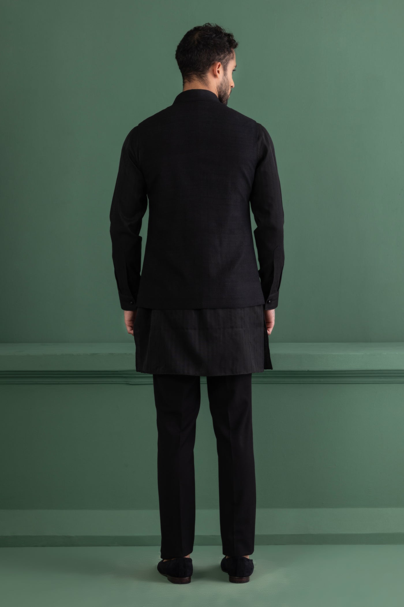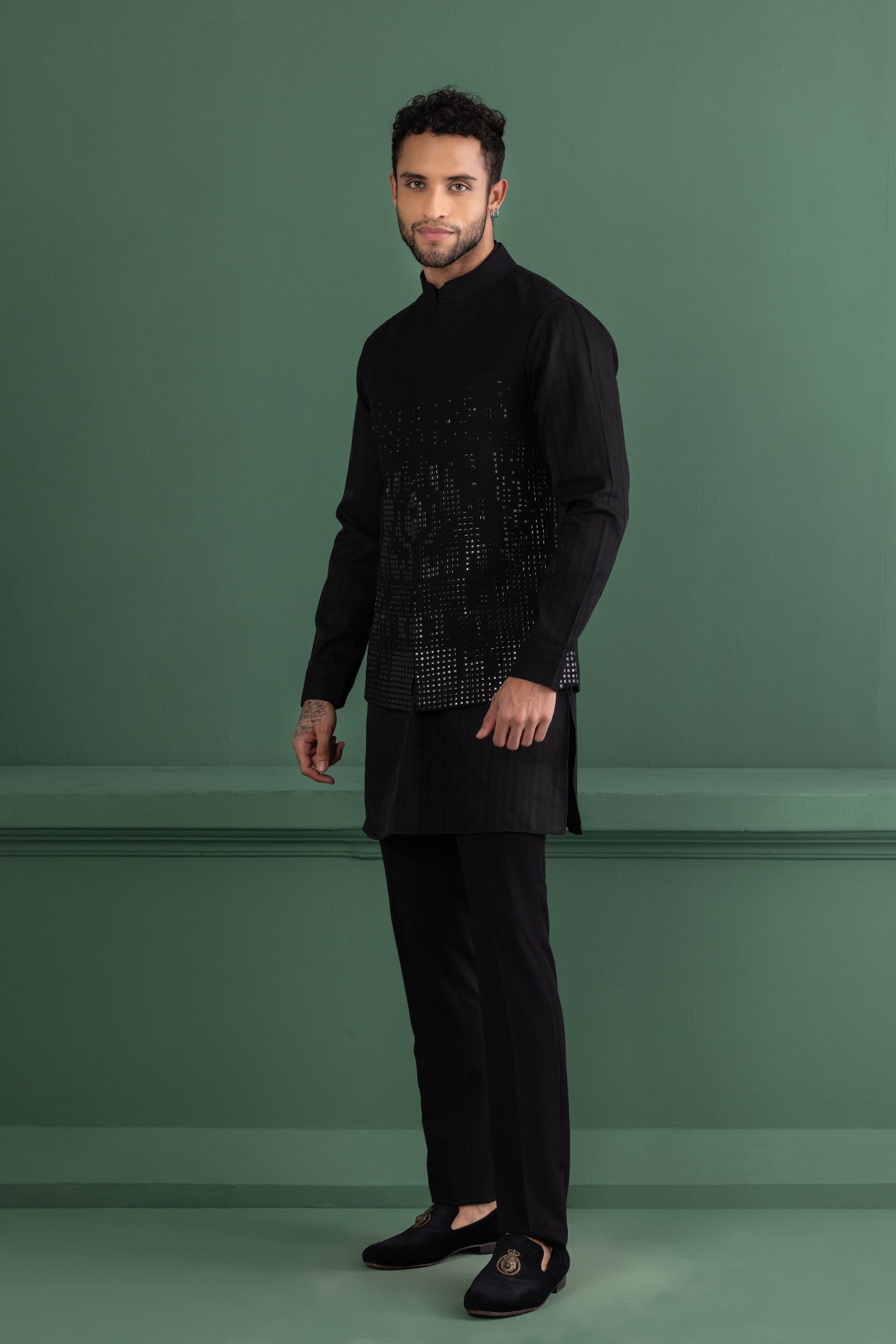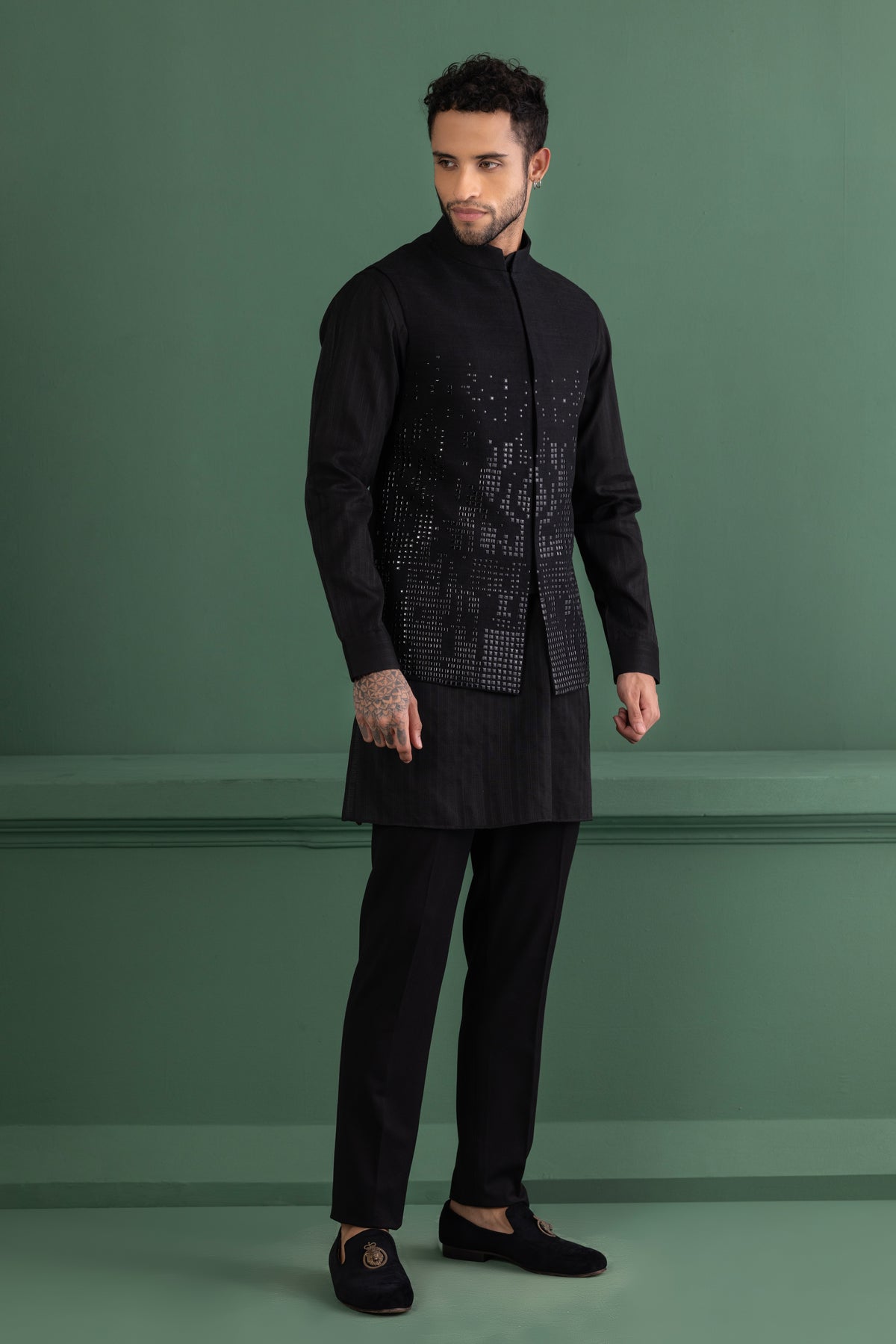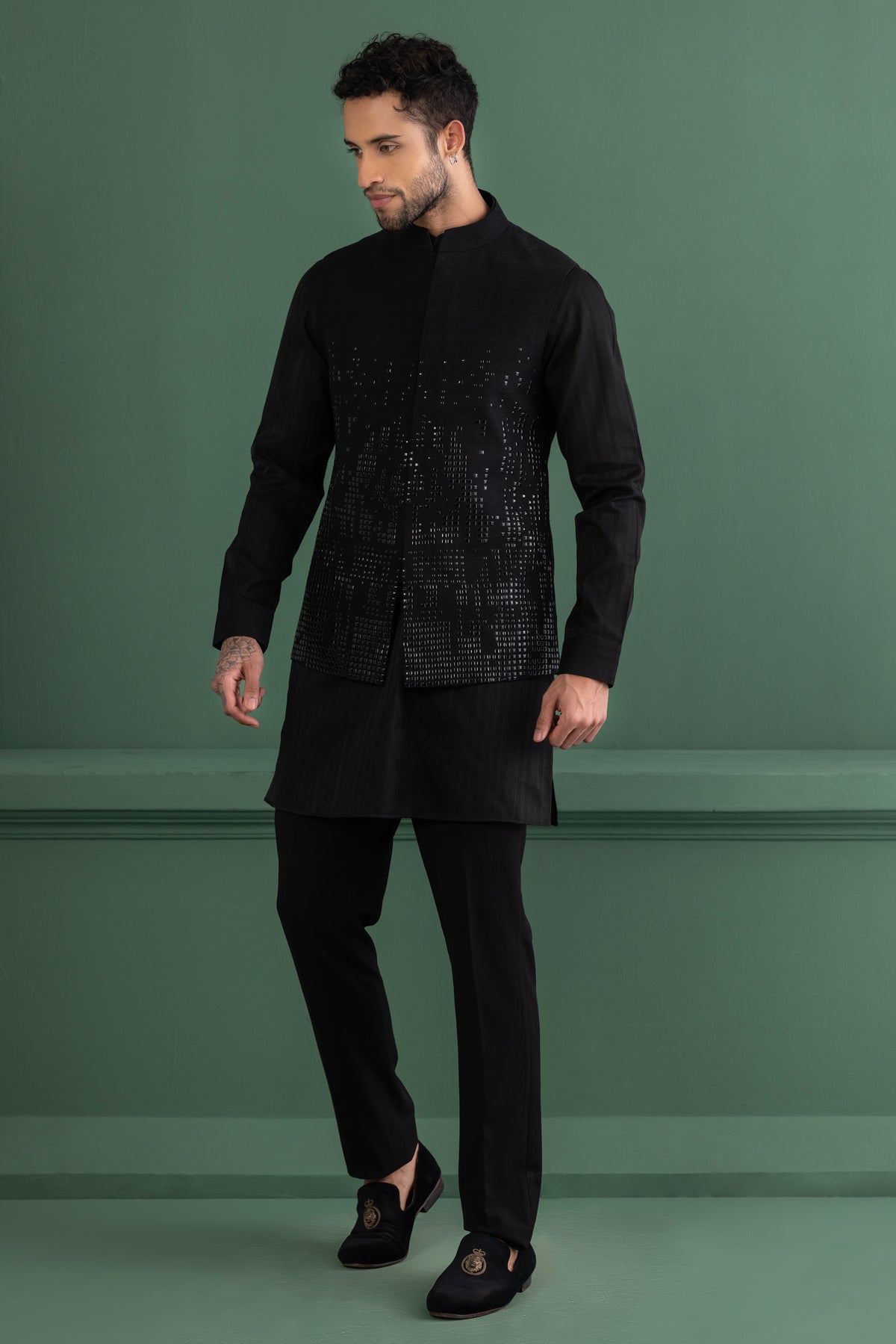 Black waistcoat with metal wotk paired with a matching kurta and aligadhi set