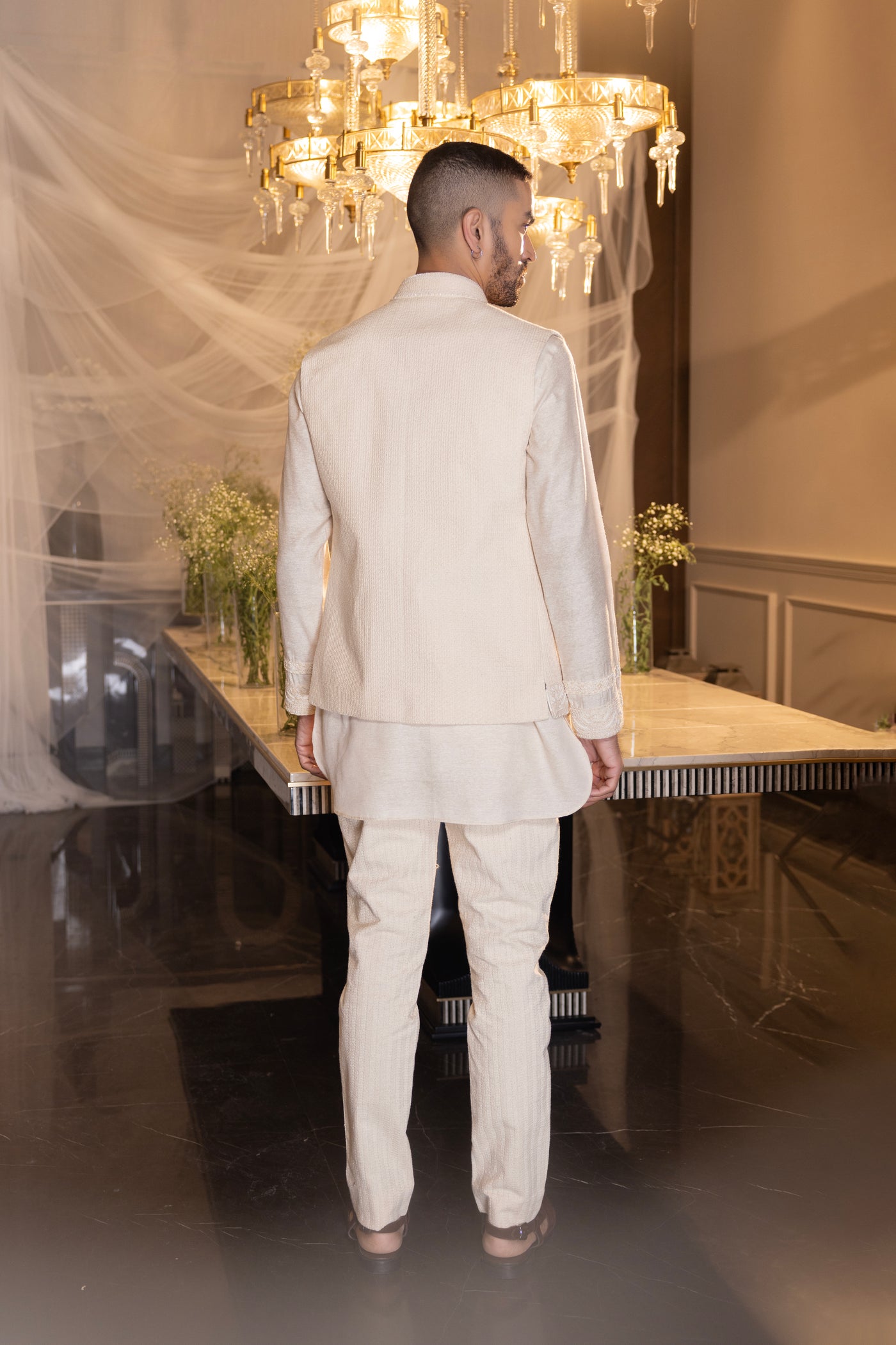 Cream waistcoat with intricate montone hand-embroidery paired with an embroidered kurta and crochet pants.
