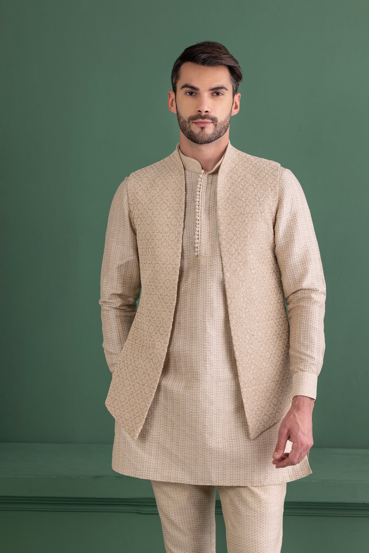 Fawn embroidered waistcoat paired with jacquard kurta and pant.
