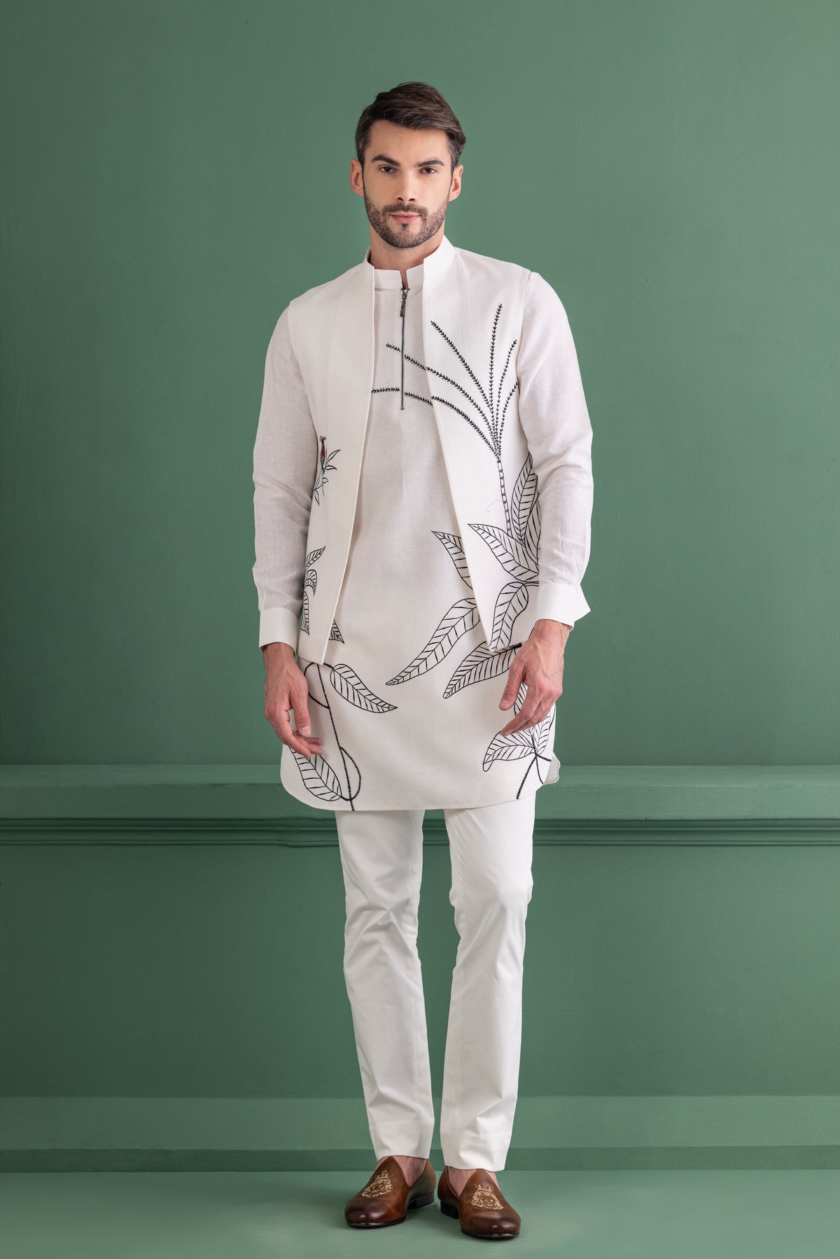 Ivory embroidered waistcoat and kurta set paired with matching aligadhi