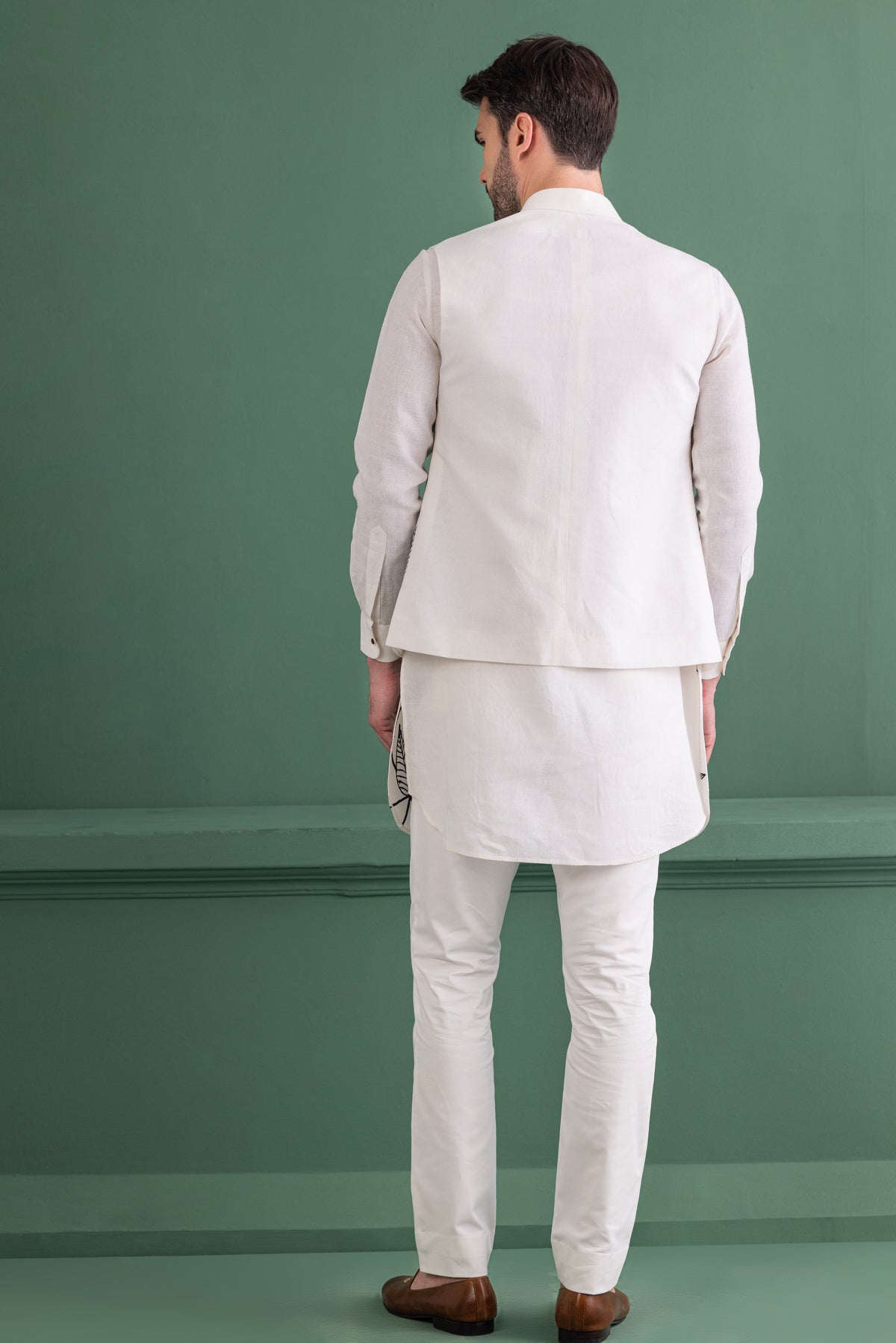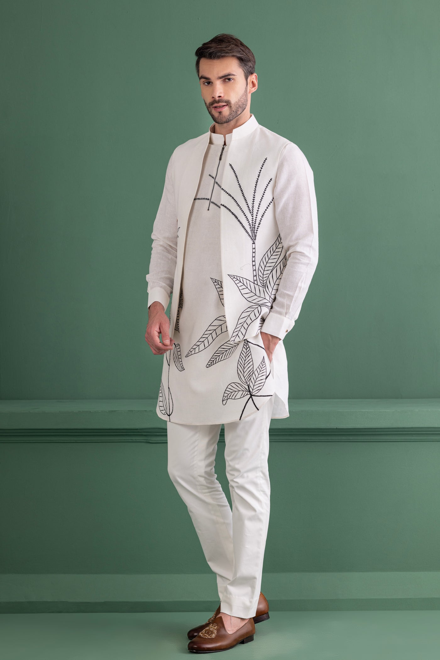 Ivory embroidered waistcoat and kurta set paired with matching aligadhi - XS/36