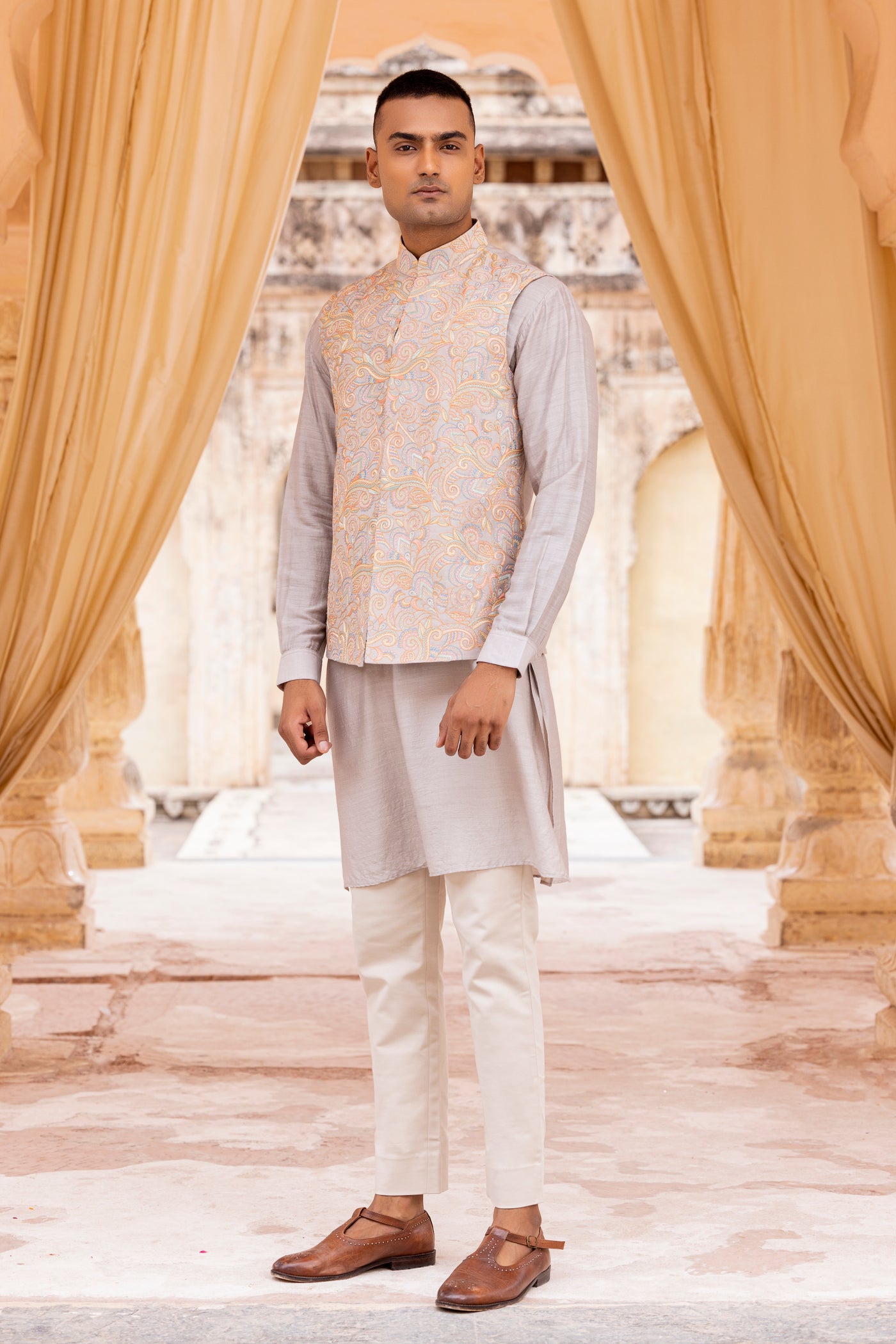 Kashmiri hand embroidery waistcoat paired with kurta and aligadhi.