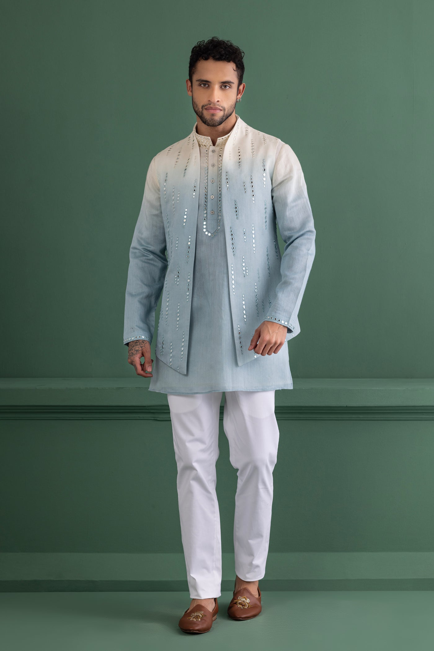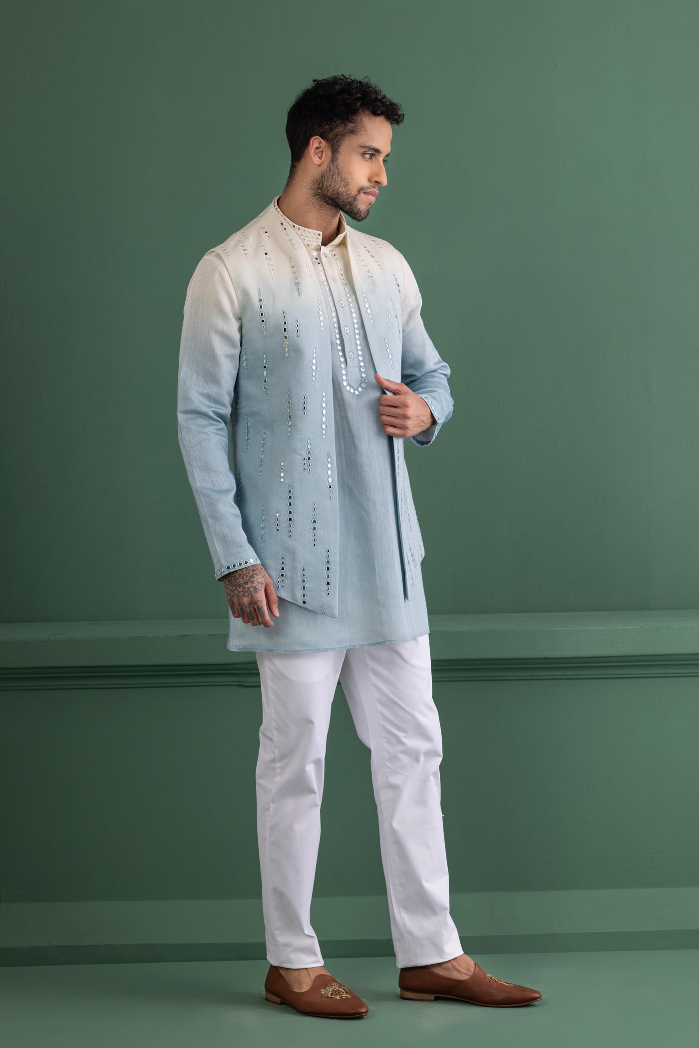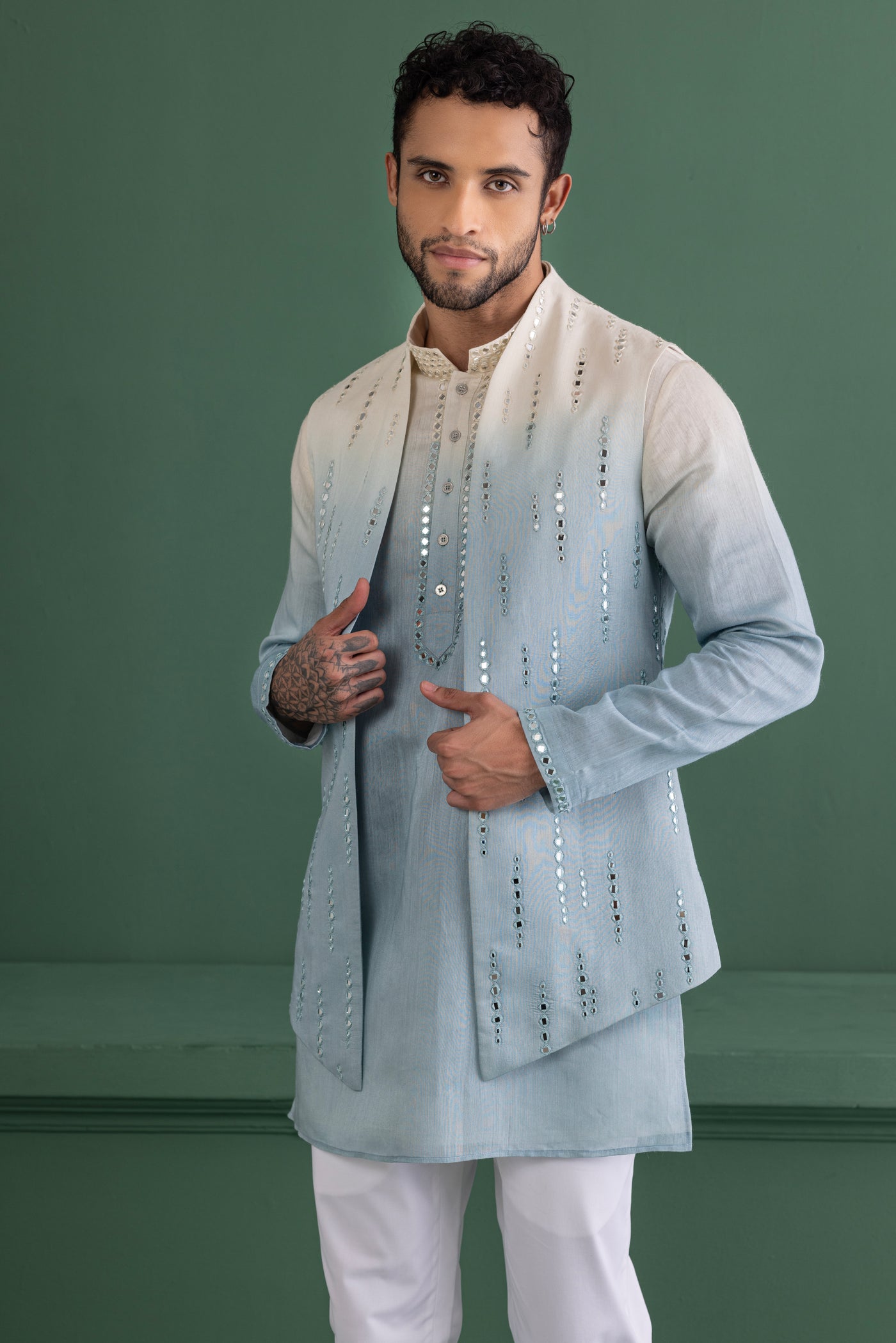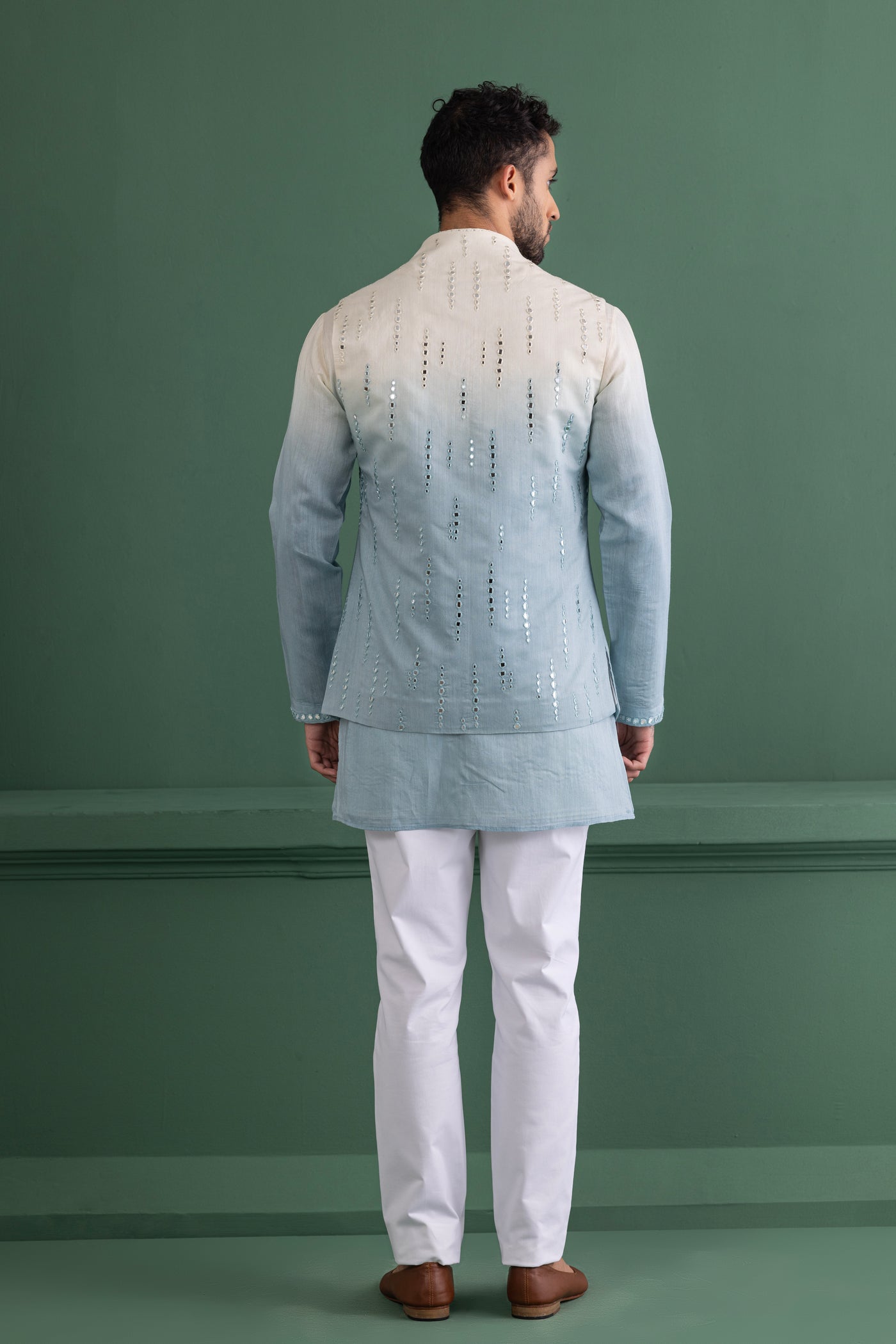Sky blue shaded waistcoat with mirror work paired with a matching kurta and off-white aligadhi