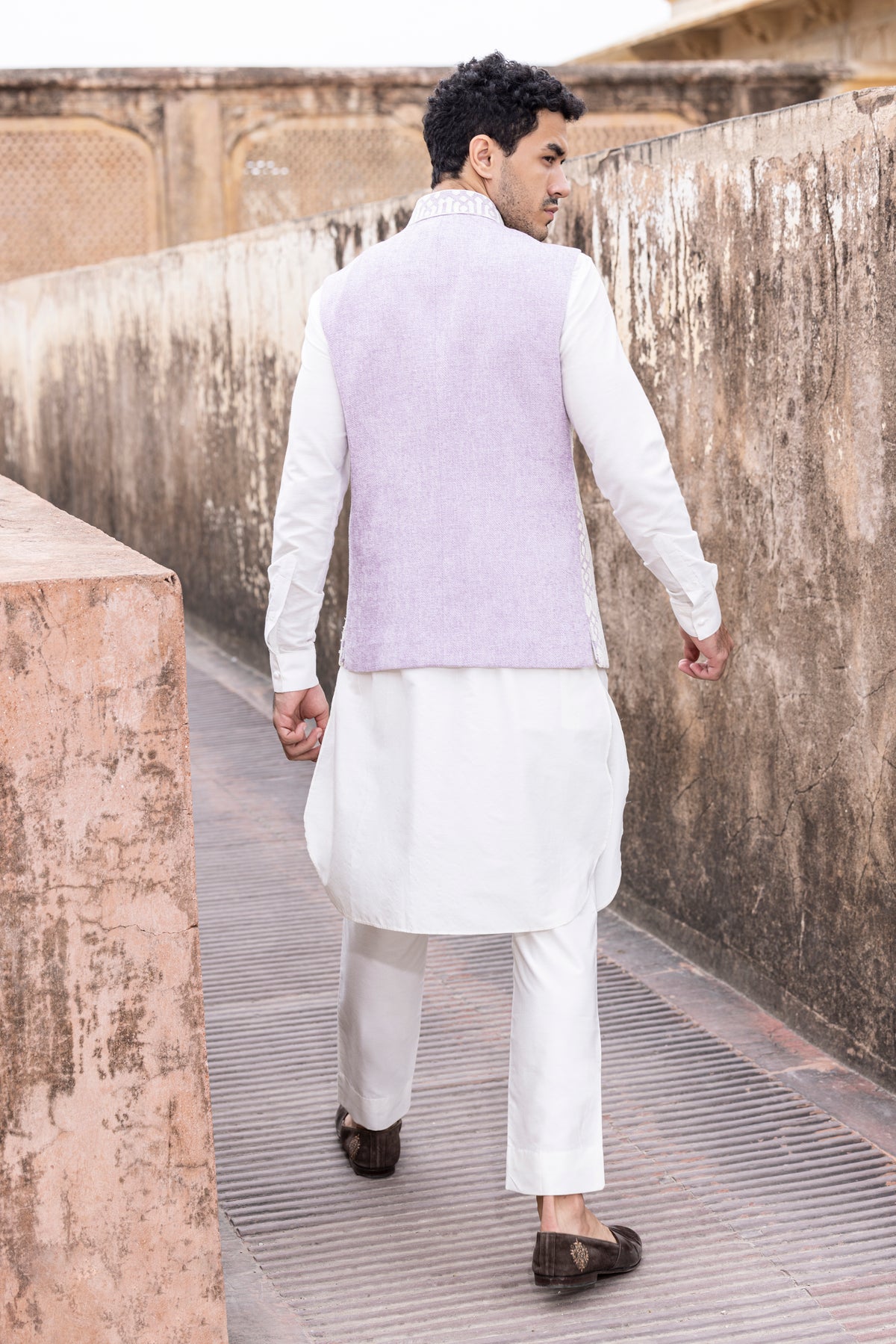 White kiran dori hand embroidery waistcoat paired with kurta and aligadhi.