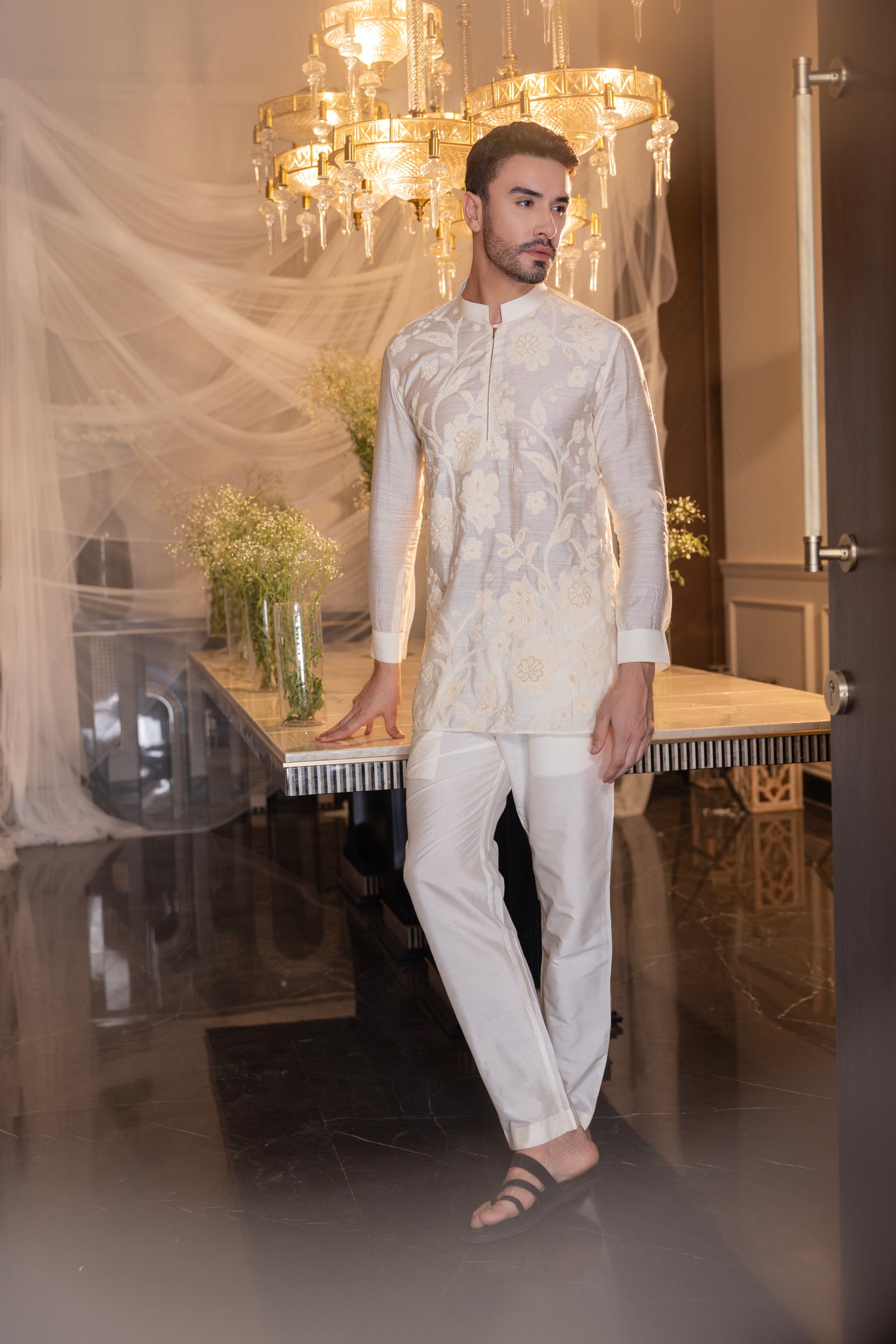 Cream hand-embroidered short kurta paired with a matching aligadhi.