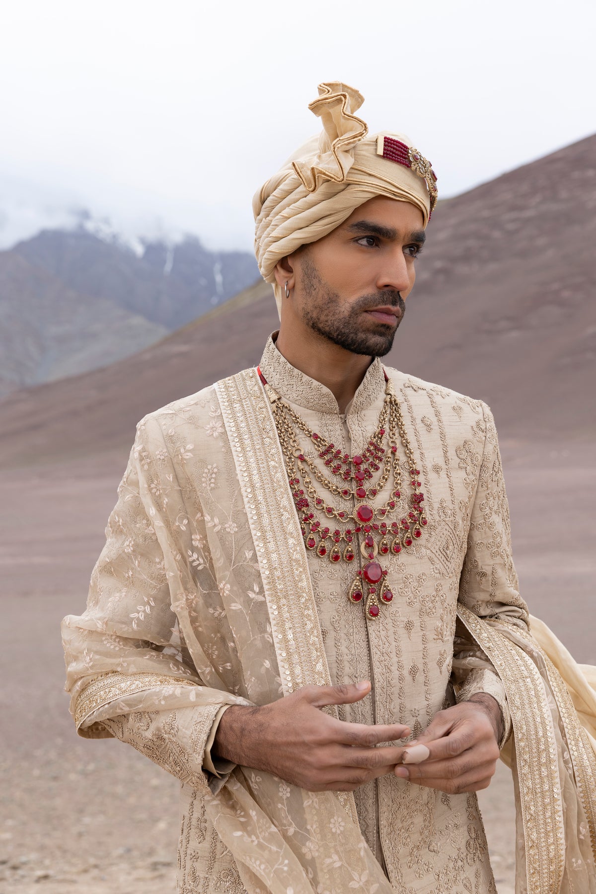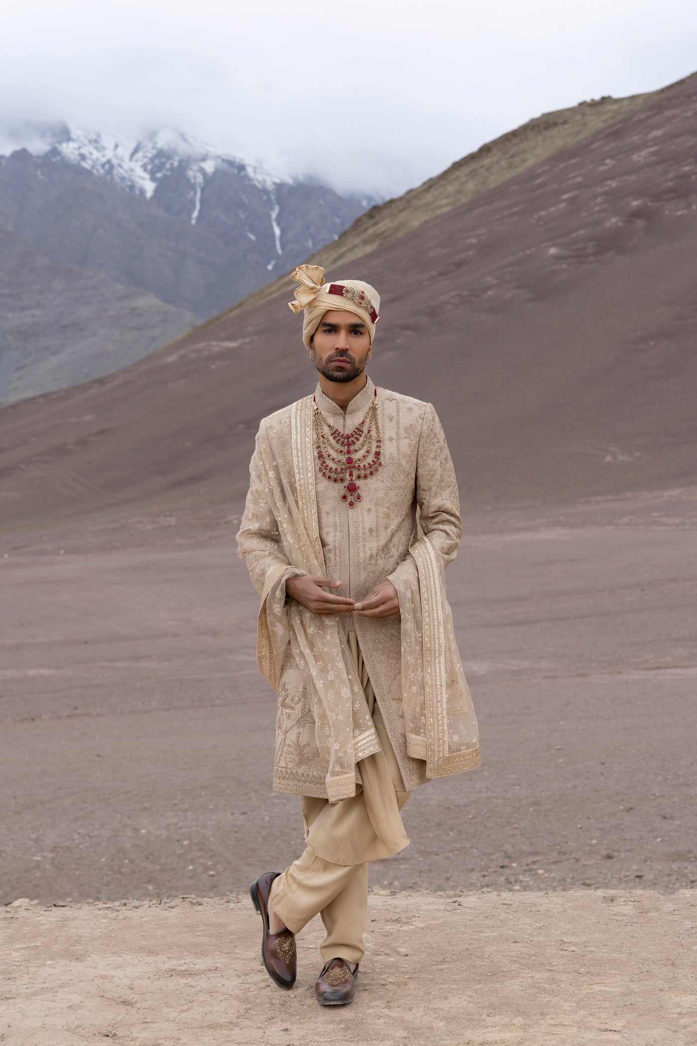 Gold raw silk sherwani with intricate hand-embroidery paired with a modal kurta pyjama & an embroidered georgette stole.